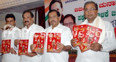 Photo Caption : CM Siddaramaiah with Dr G Parmeshwar, KPCC President with Ministers KJ George, Ramalinga Reddy, Rizwan Arshad and others releasing the Congress Manifesto for the upcoming BBMP Elections at Hotel Capitol, in Bangalore on Monday 10th August 2015