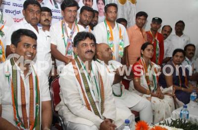 Photo Caption : Congress leader DK Shivakumar seen with congress candidates from Rajajinagar for the upcoming BBMP elections seen at the Rajajinagar vidhansabha youth congress committee meeting at Basaweshwarnagar, in Bengaluru on Wednesday 12th August 2015
