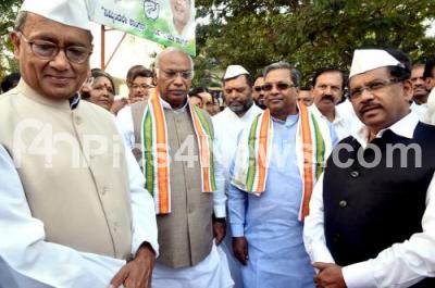 Event Description : Karnataka CM Siddaramaiah with Mallikarjuna Kharge, Congress Opposition Leader in Loksabha and Digvijay Singh, AICC General Secretary partake in 69th Independence Day celebrations at party office, in Bengaluru on Saturday 15th August 2015