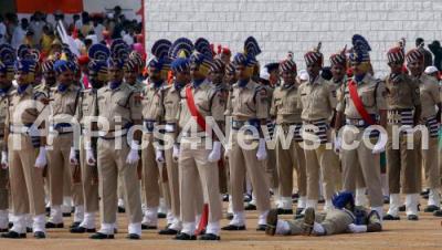 Photo Caption : Police personnel, who fainted during Independence march past at Field marshal Manekshaw parade grounds, in Bengaluru on Saturday 15th August 2015