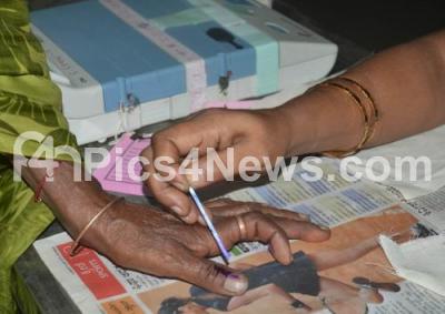 Photo Caption : A poll booth officer applying ink mark to one of the voters during the BBMP elections, in Bengaluru on Saturday 22nd August 2015