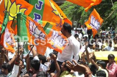 BJP supporters celebrates their victory in BBMP election at Ambedkar Stadium, Basaveshwara Nagar, in Bangalore on 25th August of 2015