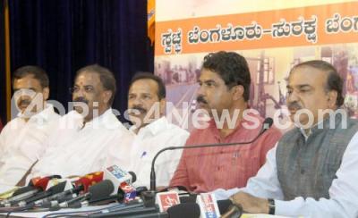 Photo Caption : BJP leaders Ananth Kumar, Sadananda Gowda, R Ashok and others addressing a press conference after BJP emerged victorious in the BBMP Elections, in Bengaluru on Tuesday 25th August 2015