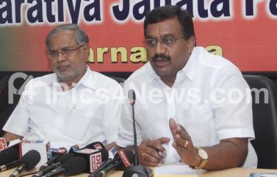 Photo Caption : BJP leaders Suresh Kumar and Ashwatnarayan addressing a press conference at BJP office, Malleswaram, in Bengaluru on Monday 31st August 2015