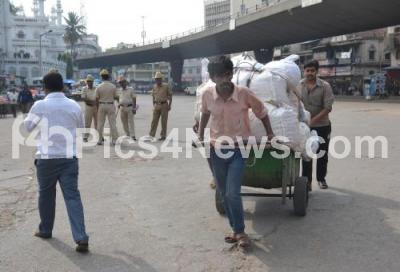 Photo Caption : An handcart being pushed passing the police personnel on vigil at the busy KR Market, following 10 central trade unions called Nationwide strike to protest against the labour reforms proposed by the Central government, in Bengaluru on Wednesday 2nd September 2015