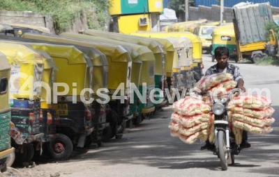 Photo Caption : Auto Rickshaws parked on the road side at Gopalapura, Magadi Road, following 10 central trade unions called Nationwide strike to protest against the labour reforms proposed by the Central government, in Bengaluru on Wednesday 2nd September 2015