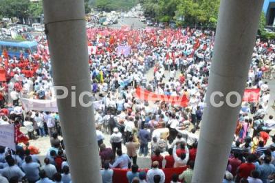 Photo Caption : Various organizations partake in protest rally at Town Hall, following 10 central trade unions called Nationwide strike to protest against the labour reforms proposed by the Central government, in Bengaluru on Wednesday 2nd September 2015