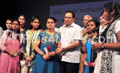 Photo Caption : Education Minister Kimmane Ratnakar and General Secretary of Dayananda Sagar Education Institutions Gaali Swamy and Principals of PU Colleges are seen Congratulating Students who topped in PU exams, organized by Dayanand Sagar City PU College principals association at Dayananda Sagar Engineering college, in Bengaluru on Monday 7th September 2015