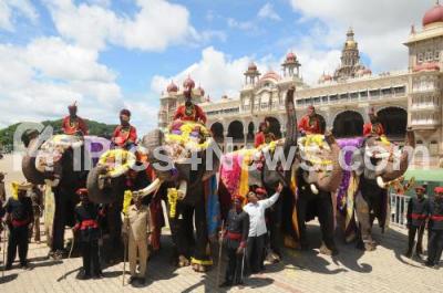 First heard of Dasara elephants get a grand welcome at the Mysuru Palace for the Dasara Festival 2015, in Mysuru on Wednesday 9th September 2015