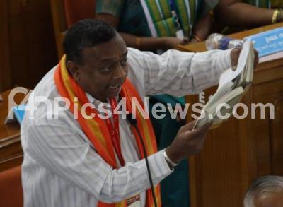 Photo Caption : BJP MLA Jagadish Kumar seen arguing during the Mayor and Deputy Mayor Election at BBMP office, in Bengaluru on Friday 11th September 2015
