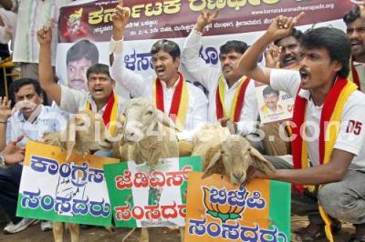 Photo Caption : Members of Karnataka Ranadheera Pade protesting with sheeps against Karnataka all party MPs, during their protest for Kalasa bandhuri project at Gandhi Statue, Anand Rao Circle, in Bengaluru on Saturday 12th September 2015