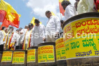 Event Description : Various Kannada organizations led by former MLA Vatal Nagaraj protesting for Kalasa Banduri project at SBM Circle, in Bengaluru on Sunday 13th September 2015