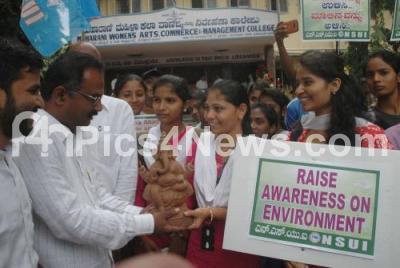 Photo Caption : Students of Maharani College with BBMP Mayor BN Manjunath Reddy participated in awareness rally for Eco Friendly Ganesha Idols, to create awareness among citizens for the use of Eco Friendly Ganesha Idols for the upcoming Ganesha festival, organised by NSUI at Maharani College, in Bengaluru on Monday 14th September 2015