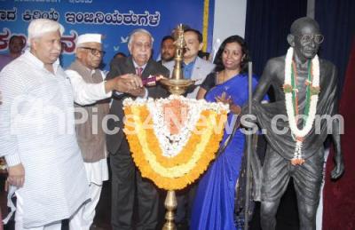 Photo Caption : Former Justice MN Venkatachalaiah seen interacting with Minister HK Patil and Ho Srinivasaiah and others inaugurating the 48th Engineers Day program at Gandhi Bhavan, in Bengaluru on Tuesday 15th September 2015