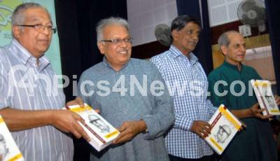 Photo Caption : Poet Dr HS Venkateshmurthy with Natarajan (Grandson of DV Gundappa), HS Umesh and Ravi Thirumali at the release of "Kaggarasadhare" book at Kannada Sahitya Parishat, in Bangalore on Sunday 20th September 2015