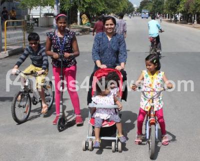 Photo Caption : Children enjoying using their bicycles on the roads of HSR layout on the vehicle free street in HSR Layout with no private vehicles allowed to ply on the streets for a day, marking the first open street day in city, in Bangalore on Sunday 20th September 2015