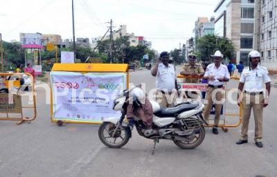 Photo Caption : Traffic police seen keeping a check for motorists, where only bicycles and BMTC busses were allowed to ply on the roads of HSR layout on the Vehicles free day organized by BMTC, in Bangalore on Sunday 20th September 2015