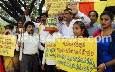 Event Description : Members of Kannada Anushtana Mandali protesting against Central Government for their decision on Hindi language at SBM Circle, in Bengaluru on Thursday 24th September 2015