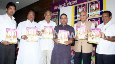 Photo Caption : MP Pratap Simha with MLC KS Eshwarappa, MLA S Suresh Kumar, BJP State President Pralhad Joshi and Book Author MG Akbar releases "Dheya Kamala" book at BJP office, in Bengaluru on Friday 25th September 2015