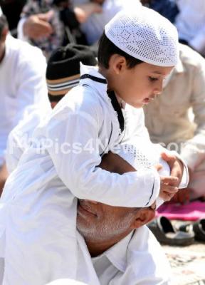 Photo Caption : A kid seen enjoying his grandfather during prayer at Eidgah ground, Chamarajpet, in Bengaluru on Friday 25th September 2015