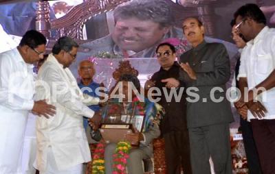 Photo Caption : CM Siddaramaiah with Dr G Parameshwar, Ghulam Nabi Azad, Congress leader, Sri Sri Sri Pejawar Visveshatheertha Swamiji, KP Nanjundi, CM Ibrahim and others felicitated Kapil Dev, Former Indian Cricketer at the 7th Rajyamattada Vishwakarma Jayantotsava, organised by Akhila Karnataka Vishwakarma Mahasabha at National College ground, Basavanagudi, in Bengaluru on Sunday 27th September 2015