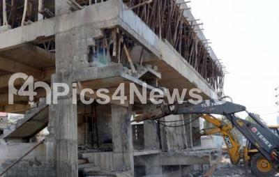 Photo Caption : JCB vehicles demolishing illegal construction near PES College, in Bengaluru on Monday 28th September 2015