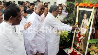 Photo Caption : CM Siddaramaiah with Home Minister KJ George and DH Shankara Murthy, Council Chairperson and others floral tribute to portrait of Mahatma Gandhi on the occasion of Gandhi Jayanti at Vidhan Soudha, in Bengaluru on Friday 2nd October 2015