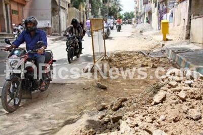 Photo Caption : Riding a bike has become very difficult at the Srirampura Road, as the condition of the road and the potholes has gone worse, in Bengaluru on Saturday 3rd October 2015