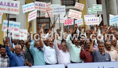Photo Caption : Members of All India Bank Retirees Federation protested to fulfill their various demands in front of Town Hall, in Bengaluru on Monday 5th October 2015