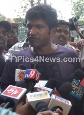 Photo Caption : Actor Puneet Rajkumar addressing the media about the health of his brother Shivarajkumar outside the Mallya Hospital, where Actor Shivarajkumar is being treated for heart attack, in Bengaluru on Tuesday 6th October 2015
