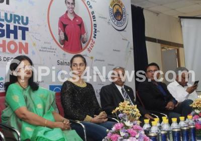 Event Description : Indian Badminton Champion Saina Nehwal is seen with Rajni Mishra, Chief General Manager, SBI and others addressing a press conference regarding the upcoming SBI Bengaluru Midnight Marathon 2015 at SBI head office, St Marks Road, in Bengaluru on Wednesday 7th October 2015