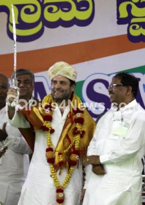 Photo Caption : Rahul Gandhi, AICC Vice President felicitated by Dr G Parameshwar and others during the Gram Swaraj Samavesha program at Palace Grounds, organised by KPCC, in Bengaluru on Friday 9th October 2015