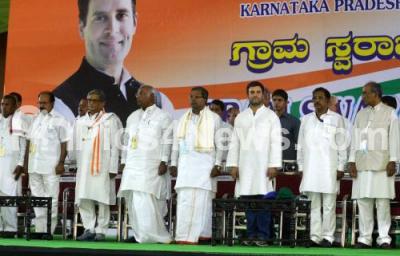 Photo Caption : Rahul Gandhi, AICC Vice President with by Dr G Parameshwar, CM Siddaramaiah and others inaugurated the Gram Swaraj Samavesha program at Palace Grounds, organised by KPCC, in Bengaluru on Friday 9th October 2015