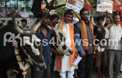 Photo Caption : BJP State SC Morcha members protested against the the Congress government on dissolution of Goseva Ayoga at SBM Circle, in Bengaluru on Friday 9th October 2015