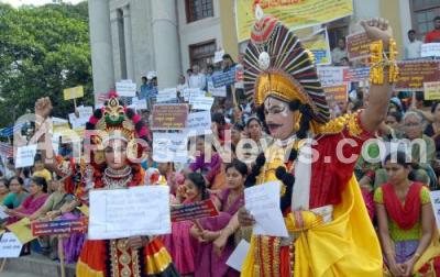 Photo Caption : Members of Dharmaranga Kalachintana Sadbhavan Okkuta protesting and demanding full fill their various demands at Town Hall, in Bengaluru on Sunday 11th October 2015