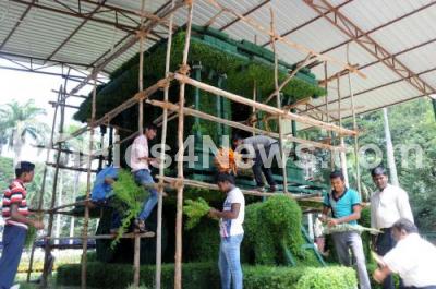Photo Caption : Workers seen giving final touches to the replica of the stone chariot of Hampi, which will be the main attraction at the flower show to be inaugurated at Kuppanna Park tomorrow for the upcoming Dasara Festival, in Mysuru on Monday 12th October 2015