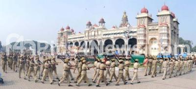 With just four days left for the grand finale of this year’s Dasara, a full-fledged rehearsal of the Jumboo Savari with all the elephants and Police contingents in attendance, was held in the Mysuru Palace premises, in Mysuru City on Monday 19th October 2015
