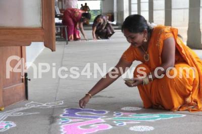 Photo Caption : Vidhan Soudha staff seen drawing rangoli for the office pooja on the eve of Ayudha Pooja at Vidhana Soudha, in Bengaluru on Wednesday 21st October 2015