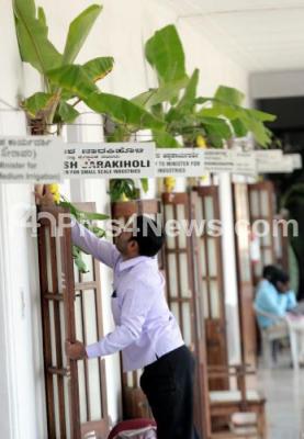 Photo Caption : Vidhan Soudha staff preparing for the office pooja on the eve of Ayudha Pooja at Vidhan Soudha, in Bengaluru on Wednesday 21st October 2015