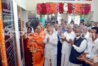 Photo Caption : Sri Keshavananda Bharathi Swami of Yadaneeru Mutt, Kasargod with Ex Governor M Rama Jois, Krishna Bhatt, MLC A V Prasanna, President, Satya Praksh, Secretary and Others at the inauguration of platinum jubilee building of Babburukamme Seva Samithi at Seshadri Road, in Bengaluru on Sunday 25th October 2015