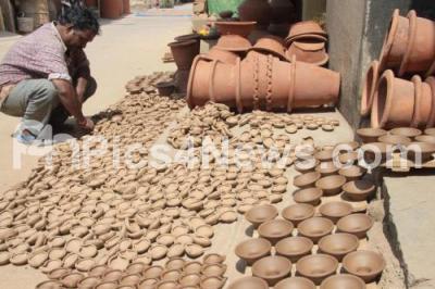 A worker preparing deepavali lamps for the forthcoming Deepavali festival at Pottery Town, in Bangalore on 26th October of 2015, in Bengaluru on Monday 26th October 2015