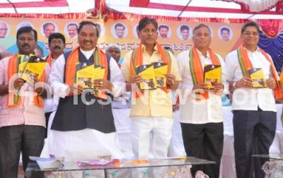 Photo Caption : BJP leaders KS Eshwarappa, V Somanna and others releasing a brochure at the inauguration of the BJP SCST and backward class convention meeting at Chandrashekhar Azad Play Ground in Malleswaram, in Bengaluru on Wednesday 28th October 2015