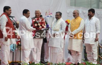 Photo Caption : Governor Vajubhai Rudabhai Vala with CM Siddaramiah greeting the newly sworn in ministers Dr G Parameshwar, Manohar Tahasildar, A Manju and Vinay Kulkarni during the swearing in ceremony at Rajbhavan, in Bengaluru on Thursday 29th October 2015
