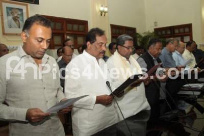 Photo Caption : CM Siddaramaiah with Ministers KJ George, Dinesh Gundu Rao and others seen taking oath on the National Unity Day to mark the National Integration Day on the occasion of 140th birth anniversary celebration of Iron Man of India, Sardar Vallabhai Patel at Vidhan Soudha, in Bengaluru on Saturday 31st October 2015