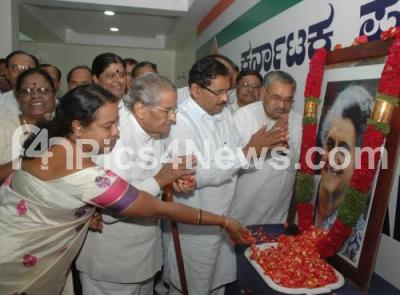 Photo Caption : Dr G Parameshwar, KPCC president and Home Minister with Minister Umashree, MV Rajashekaran, Senior Congress leader and Congress party leaders and workers floral tribute to the portrait of Smt Indira Gandhi, Former Prime Minister of India, to mark the 36th death anniversary at KPCC office, in Bengaluru on Saturday 31st October 2015