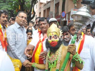 Photo Caption : Minister Dinesh Gundurao being welcomed by an artist during Kannada Rajyotsava celebrations organized by Chamarajpet Kannada Rajyotsava Samiti at Chamarajpet, in Bengaluru on Sunday 1st November 2015