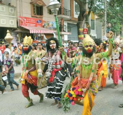 Photo Caption : Artists performing dance in the procession during Kannada Rajyotsava celebrations organized by Chamarajpet Kannada Rajyotsava Samiti at Chamarajpet, in Bengaluru on Sunday 1st November 2015