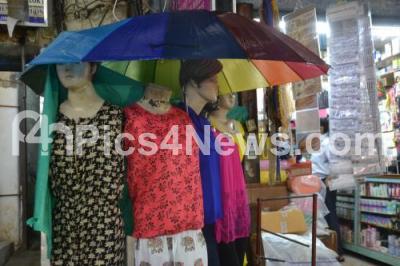 Photo Caption : Mannequins covered with umbrella at Commercial Street as heavy rains lashed out Bengaluru City, in Bengaluru on Tuesday 3rd November 2015