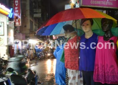 Photo Caption : Mannequins covered with umbrella at Commercial Street as heavy rains lashed out Bengaluru City, in Bengaluru on Tuesday 3rd November 2015