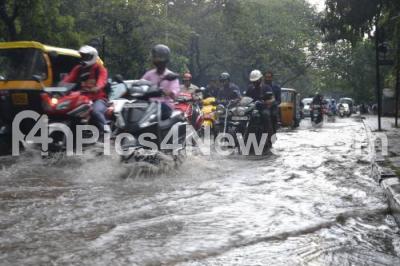 Cars and motorists negotiate the waterlogged road as rains lashed Bengaluru City, in Bengaluru on Wednesday 4th November 2015